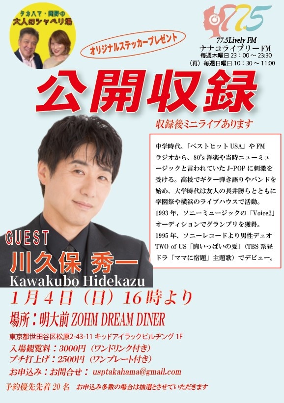 ※1/4(日)16時より京王線明大前駅そば「ZOHM DREAM DINER」にて公開収録、これに伴い観覧募集